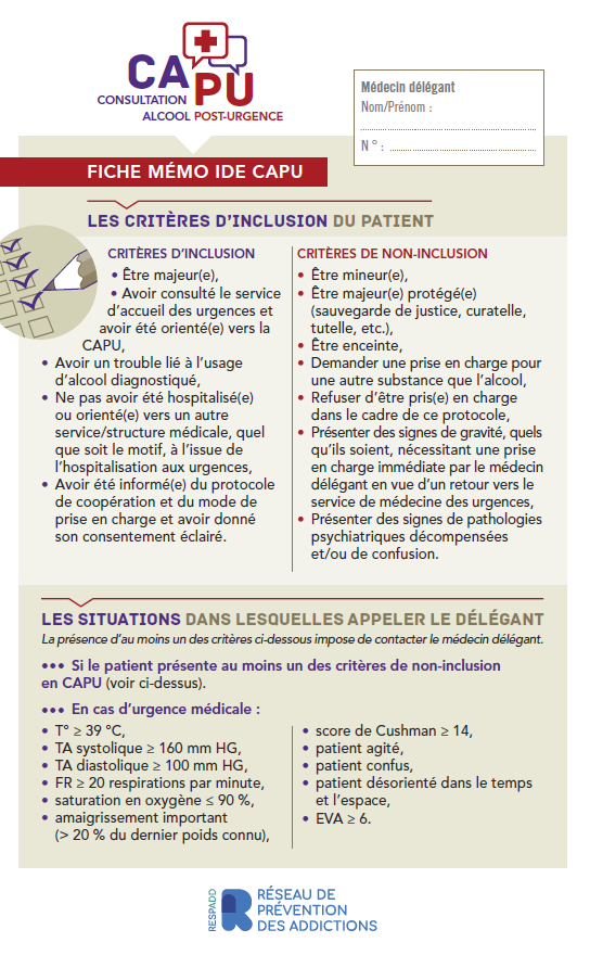 La CAPU est un protocole de prise en charge spécifique en alcoologie, conçu pour repérer et orienter les usagers présentant un trouble dû à l’usage d’alcool détecté lors d’une prise en charge au service d’accueil des urgences (SAU).
