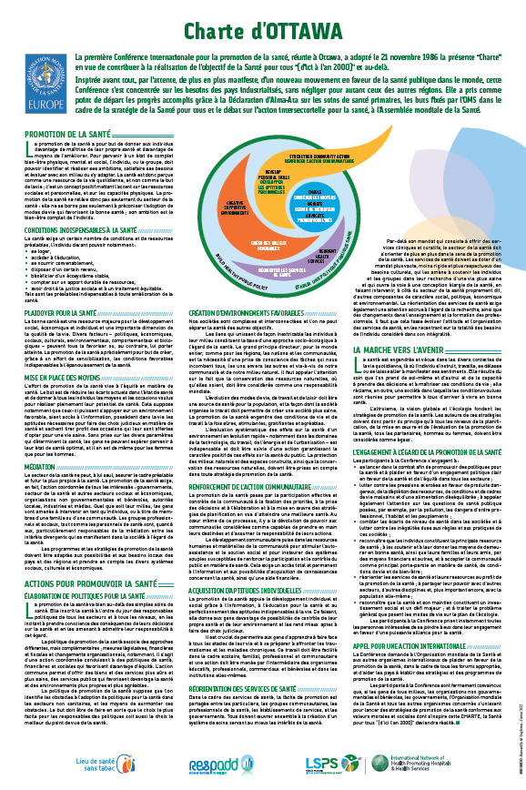 La Charte d’Ottawa pour la promotion de la santé (1986) : elle définit la promotion de la santé comme un processus permettant aux populations d’accroître la maîtrise de leur santé et d’améliorer celle-ci.