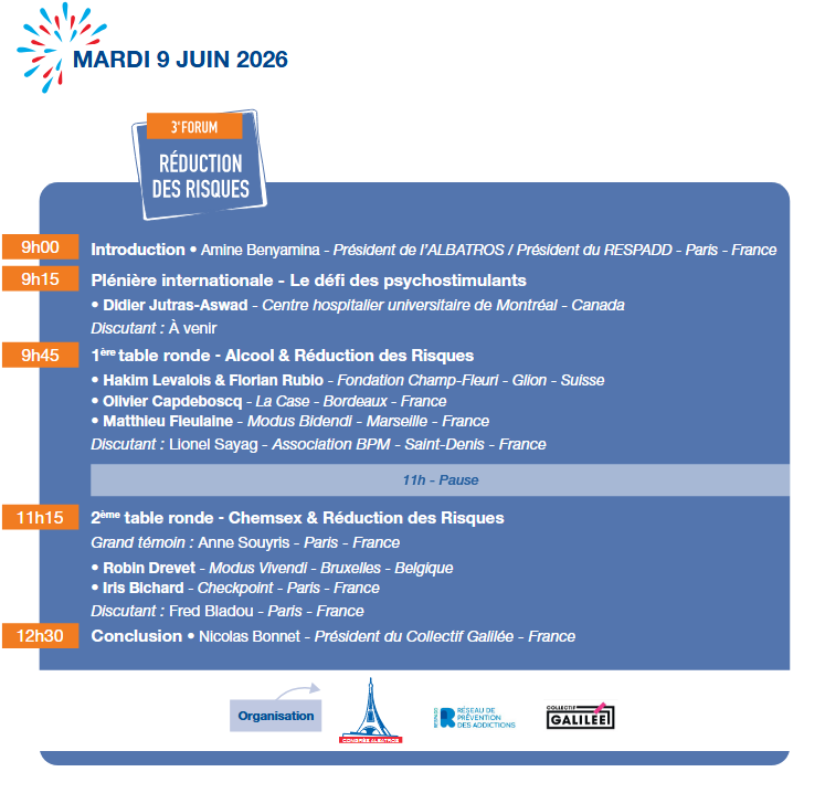 Le Collectif Galilée (RESPADD, PROSES, BIZIA, LA CASE, GAIA et le BUS 31/32) a le plaisir de vous convier à la troisième édition du Forum sur la Réduction des risques. Organisé le mardi 9 juin 2026 au Novotel Tour Eiffel, il précèdera le Congrès de l’Albatros organisé dans le même lieu du 9 au 11 juin.